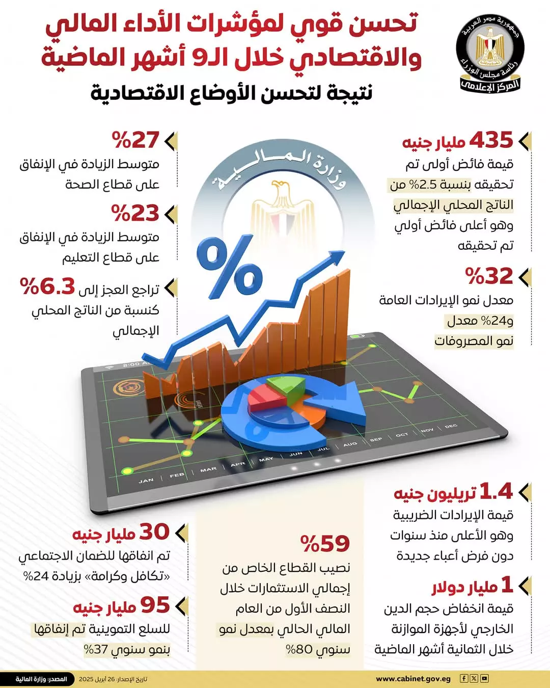شهد الأداء المالي والاقتصادي تحسنًا ملحوظًا خلال التسعة أشهر الماضية، انعكس في نمو الإيرادات وكفاءة الإنفاق، إلى جانب تراجع العجز والدين، وتزايد الاستثمارات والإنفاق الاجتماعي، ما يؤكد فاعلية السياسات المطبقة في تعزيز الاستقرار ودفع عجلة التنمية.