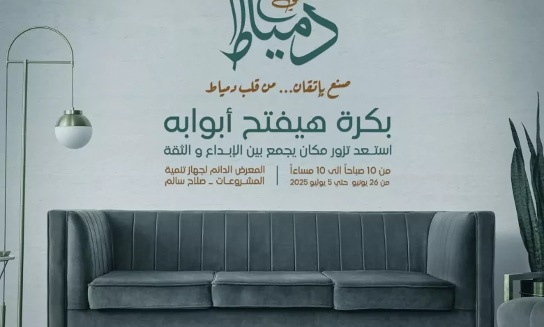 يفتتح جهاز تنمية المشروعات الدورة 24 من معرض (صنع في دمياط) الذي ينظمه الجهاز بالتعاون مع محافظة دمياط بقاعة جهاز تنمية المشروعات بأرض المعارض في مدينة نصر بالقاهرة بوابة ٤ خلال الفترة من 26 يونيو وحتى 5 يوليو القادم من الساعة العاشرة صباحا و حتي العاشرة مساءً وذلك بمشاركة ما يقرب من ٨٠ مشروع متخصص في الاثاث و الديكور من صناع الأثاث الدمياطي.